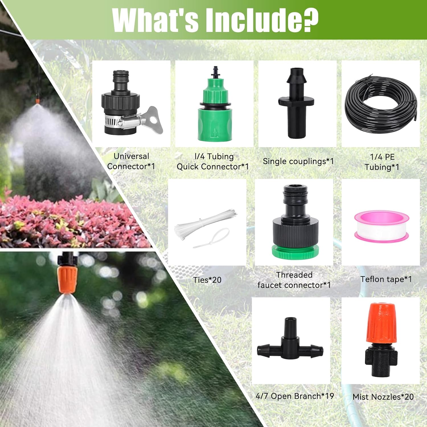 • Efficient Water Distribution System: The system supports up to 20 mist nozzles and 20 drip emitters providing comprehensive coverage for your entire garden or outdoor space. High-quality materials ensures long-lasting, leak-proof performance.