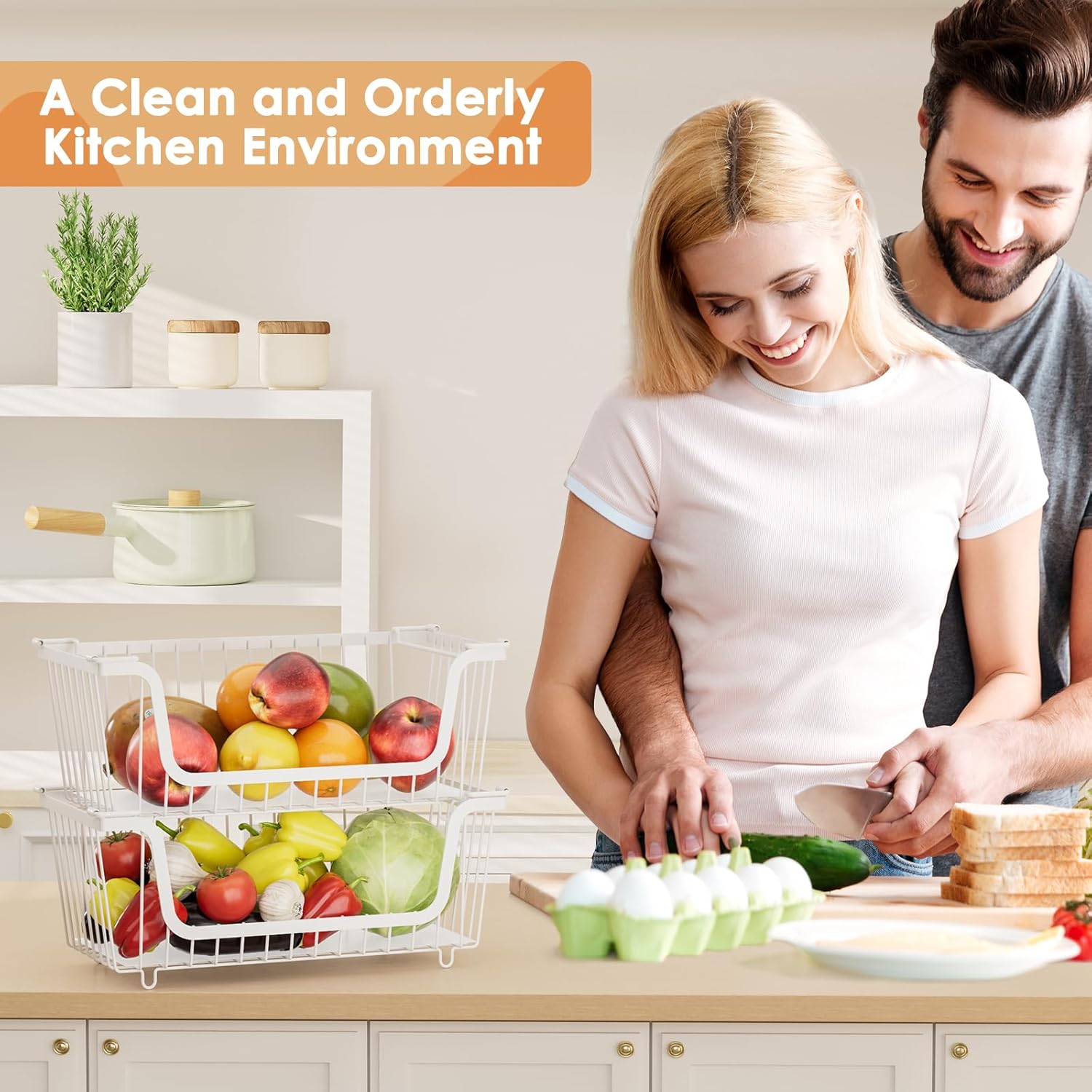 • MATERIAL UPGRADE: The kitchen organizers and storage stackable baskets is made of upgraded and thickened wire, which is stronger and has greater load-bearing capacity,and is more stable when stacked.The surface of the wire baskets is smooth-polished and painted to prevent oxidation and rust without damaging the countertop. Simple care - Just wipe clean with a damp cloth.