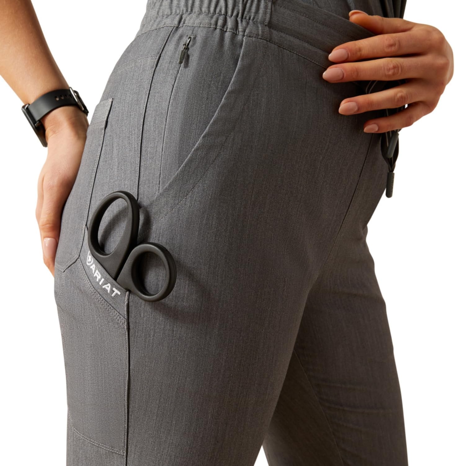The Ariat Women’s Nightingale Utility Stretch Scrub Pant offers the ease and support you need to get through the workday. Crafted from Nua recycled stretch fabric with a straight leg design, these scrubs for women deliver a tailored silhouette and a contoured fit with enough room for all-day comfort. Designed to keep you cool and fresh, it features ClimateTEK for dynamic and temperature-regulated cooling and Moisture Movement Technology to keep you dry. Silver-based FreshTEK+ ensures sustainable odor resistance, while stain-repellent fabric adds cleanliness to your attire. Thoughtful details like two front hand pockets, a single back pocket, a concealed zippered side pocket, a convenient badge holder, and a locker loop make this nursing scrub pant as practical as it is stylish. Plus, it's made from materials that meet bluesign sustainability standards, offering a responsible choice for long shifts.