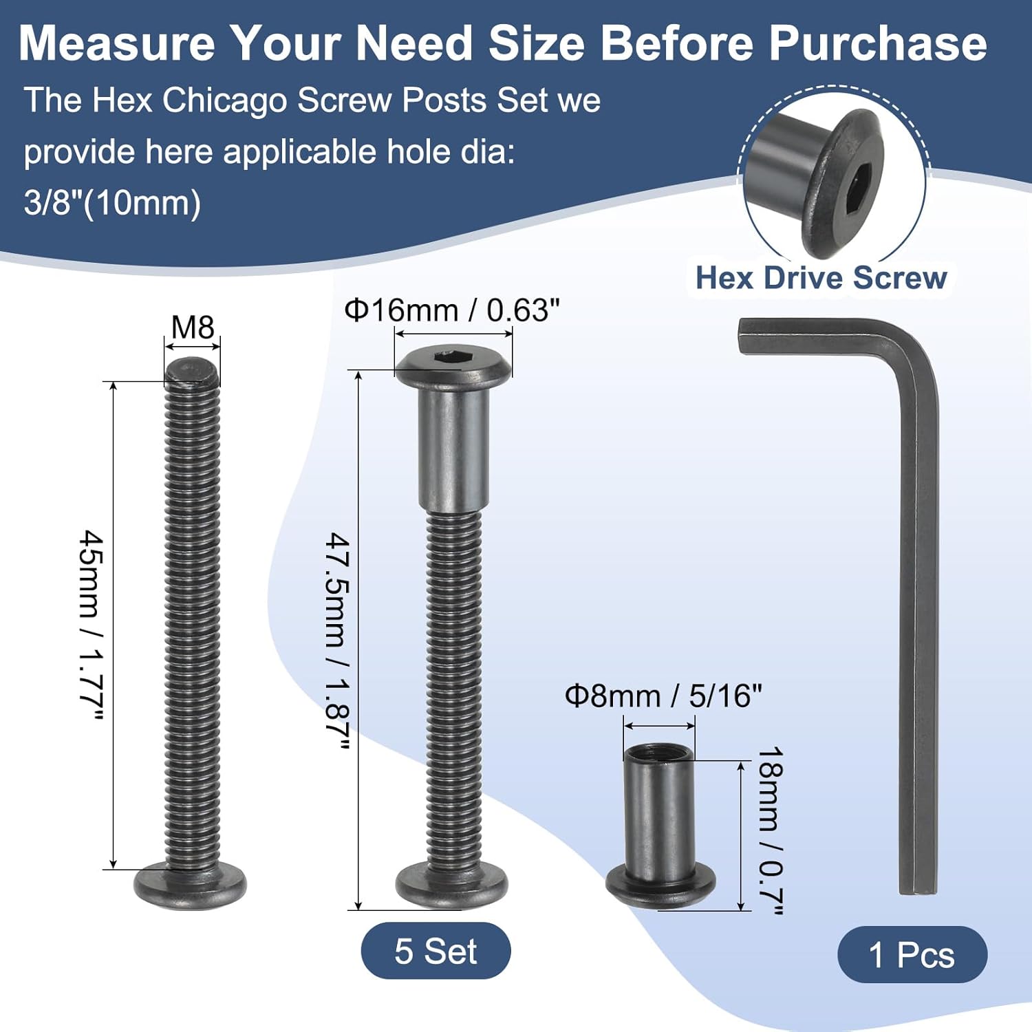 What is this?The binding screw posts are perfect for various DIY projects, leather crafting, clothing making, or as a versatile fastener to connect different items. Examples include slim photo albums, leather bags, wooden board connections, furniture installation, and more.What will I get?The Hex Chicago Screw Posts Set we provide here applicable hole dia: 3/8"(10mm); thread size: M8 x 12mm; socket size: M8 x 18mm; cap diameter: 16 mm / 0.63inch; cap thickness: 3 mm / 0.12inch; thread pitch: 1.25mm / 0.05inch; total length: 15 mm / 0.59inch; strength level: 4.8; material: carbon steelIn the package of 10 Set x Binding Screw Posts; 1 x Hex WrenchAre there any advantages of the product?Made of carbon steel, black oxide, rust-proof, high hardness, and good decorative. Hex socket head bolts, with clear threads, provide stability and can be used for a long time. Resistant to slipping, easy to tighten and remove.How to use it?Drill a hole between 0.5-1mm larger than the diameter of the socket nut, put the screw and nut on both sides of the locked object, and use the hex wrench to lock it.What should I notice?The thickness of the object being secured, must be less than the length of the screw rod & nut rod, otherwise, it will not be able to tighten.