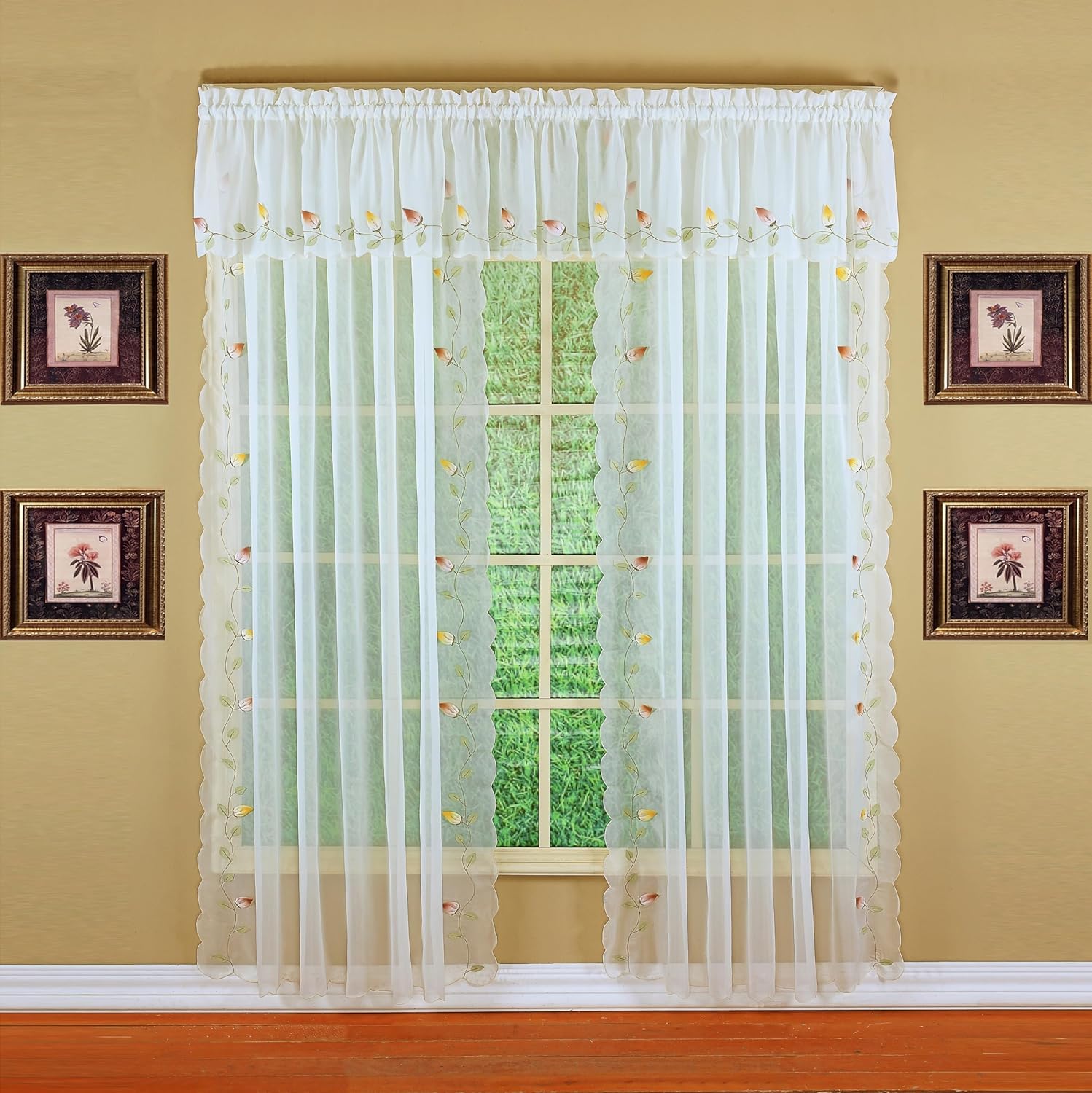 Vineyard 3-D Appliqué curtain features real 3-D hand tucked floral buds, airbrushed on each piece,lined up green leaf stenciled design, all on premium voile Sheer. Scalloped edge along the side and bottom.
